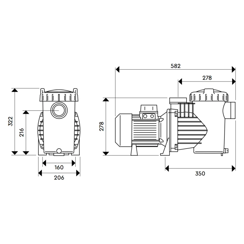 En el siguiente dibujo, podemos ver todas las medidas de la bomba de filtración. Las dimensiones están indicadas en milímetros (mm).