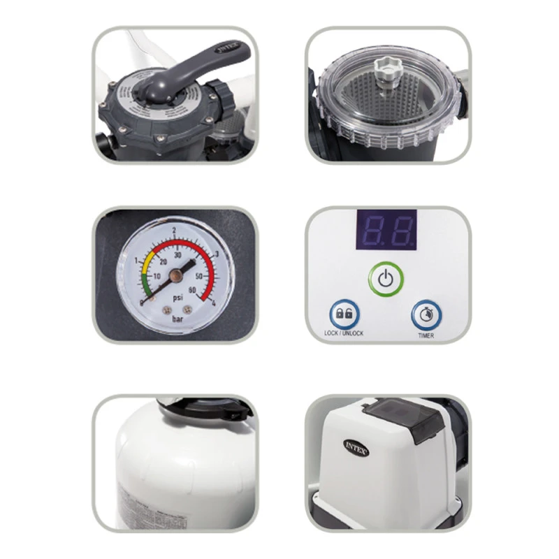 Con la depuradora de arena eléctrica de 7.900 l/h está diseñado para piscinas de hasta 37.800 litros, y tiene compatibilidad con los modelos Intex Easy Set, Metal Frame, Prisma y Oval Frame, Oval Prisma Frame, Graphie Gray Panel y Ultra Frame-XTR.