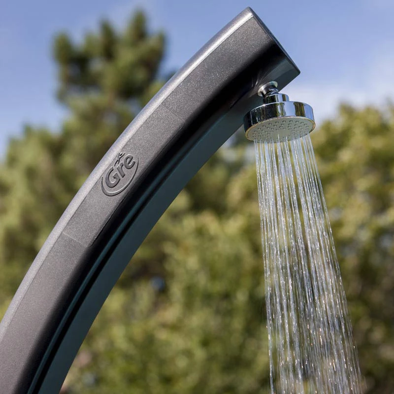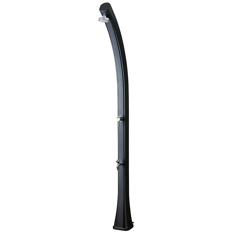 La ducha solar Gre curvada está fabricada en polietileno de color negro. Con una sola toma de agua fría, permite el calentamiento del agua mediante un depósito acumulador de 25l, aprovechando la energía solar. Esta forma de calentar una ducha, convierte la energía solar para hacer que el agua general de casa en agua templada.