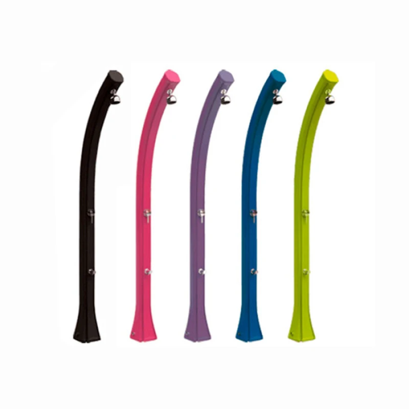 La Ducha Solar Happy está hecha de polietileno, garantía anticorrosión , y está disponible en varios colores. Esta ducha está equipada de serie con una mesa de mezclas de agua fria y caliente y un aclarado con agua fría para los pies (opcional).