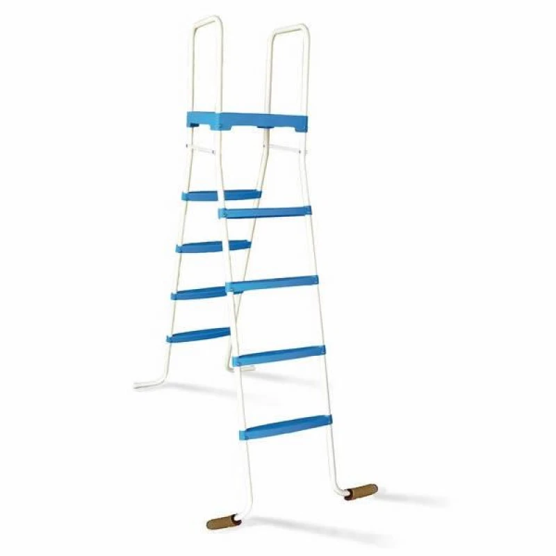 Escalera de seguridad fabricada en acero galvanizado de gran calidad y resistencia, pintada de color blanco, con entrada y salida de agua para piscinas desmontables elevadas.