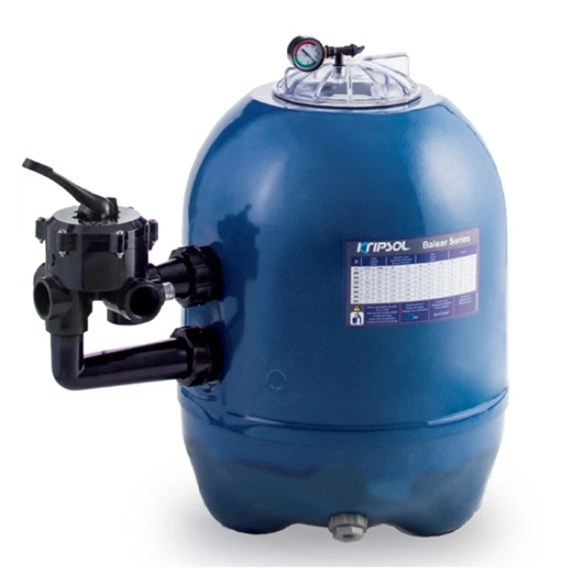 Cuba de filtración de arena para piscinas residenciales, equipada con Válvula Selectora con 6 vías de salida lateral para realizar todas las funciones de la depuradora de arena.
