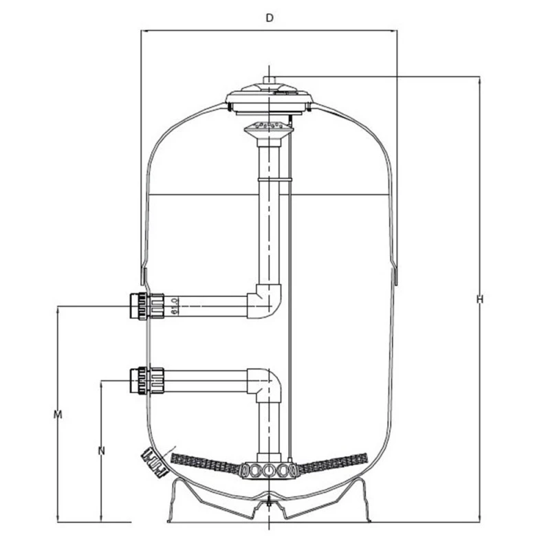 En cuanto a la descarga de arena, ésta es de 2½» y se encuentra en la parte inferior del aparato. Existe también la posibilidad de una descarga de arena opcional de 200mm de Ø. Opcionalmente el filtro tiene un acabado interior en vinilester para tratamientos con ozono.
