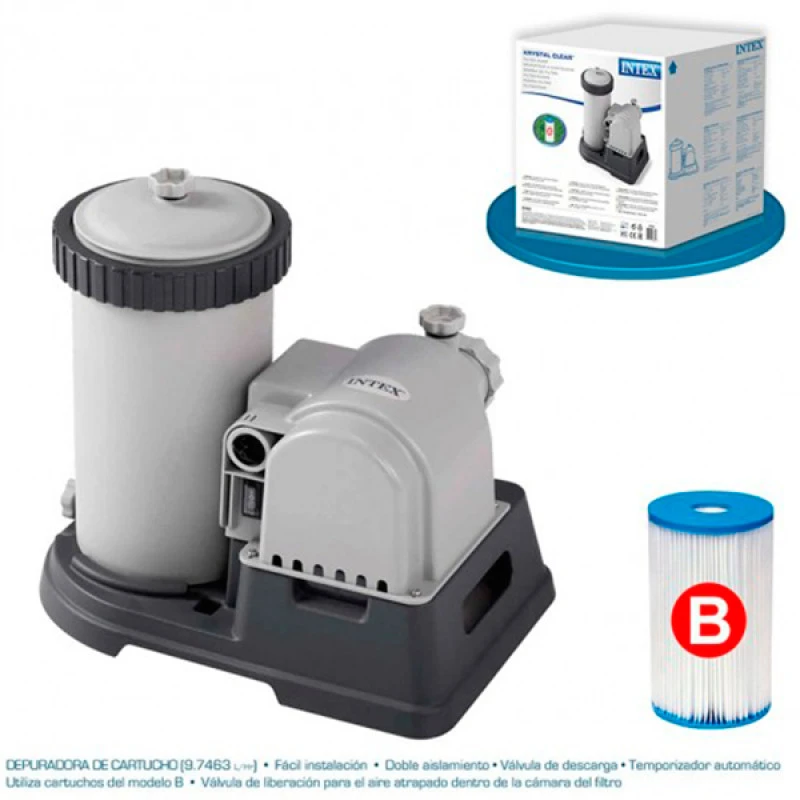 Sistema de filtración de cartucho para piscinas desmontables. Depuradora de cartucho de la casa INTEX con una capacidad de filtración muy potente de 9,463l/h ideal para Piscinas desmontables, tanto piscinas de PVC como Piscinas de Acero.