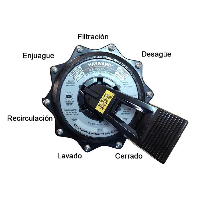 Incluye una válvula selectora de 6 vías, un sistema que permite la correcta filtración del agua gracias a sus múltiples posiciones: