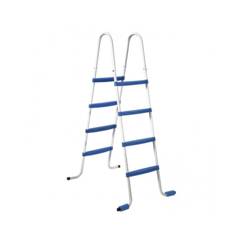 Escalera de acero pintado de blanco con 8 peldaños de pvc (4 a cada lado). También contiene protectores de espuma para que las patas que quedan en la piscina no dañen el liner, la altura de la escalera es de 1,45 mtrs.