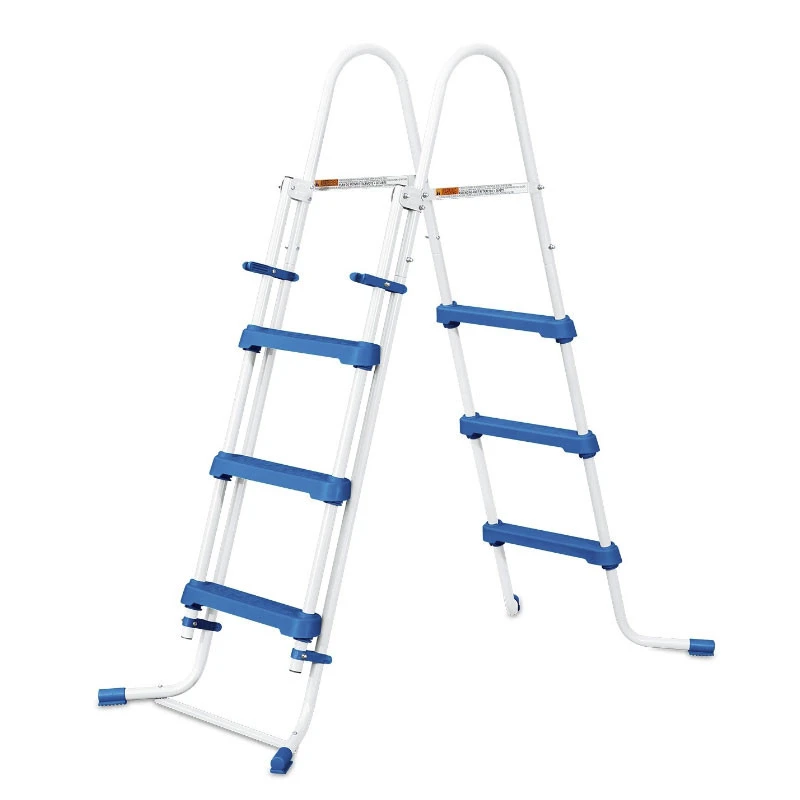 La piscina ovalada incluye una cómoda escalera con estructura de acero y peldaños de pvc en color azul.